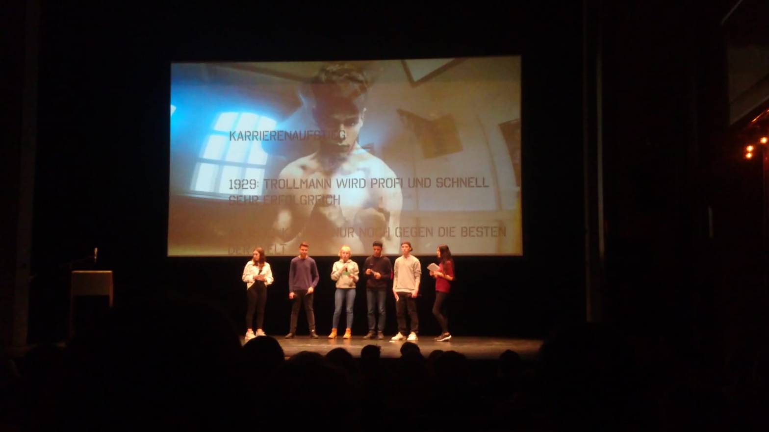 Widerstand gegen den NS im Boxring. Der Berliner Sinto Rukeli Trollmann „boxte“ gegen die Nazis, indem er sich weigerte ihren „deutschen Boxstil“ anzunehmen und sich aus Protest weiß geschminkt in den Boxring stellte. Die Nazis haben ihm zwar seinen Titel abgenommen und seine Karriere zerstört, doch hat er wirklich verloren? Die Erinnerung an ihn macht einen Sieger aus ihm. So sehen wir das auf jeden Fall und deswegen haben wir an einer Gedenkveranstaltung für verfolgte und ermordete Sinti und Roma mit einer Präsentation über Johann „Rukeli“ Trollmann teilgenommen. Bei unserer Recherche hatten wir die Ehre mit Rukeli Trollmanns Tochter Rita Trollmann zu sprechen und nutzten die Gelegenheit für ein Interview. Mit einer GoPro ausgestattet machten wir auch einen Spaziergang durch Kreuzberg, auf den Spuren Rukeli Trollmanns und besuchten den Ort, an dem er deutscher Meister im Halbschwergewicht wurde. Film und Informationen schnitten wir zusammen und fertig war unser Beitrag des Nicht-Vergessens. Auf der Bühne des HAU-Theaters präsentierten wir unser Ergebnis und leiteten damit die Gesprächsrunde mit den Zeitzeugen und Experten ein.